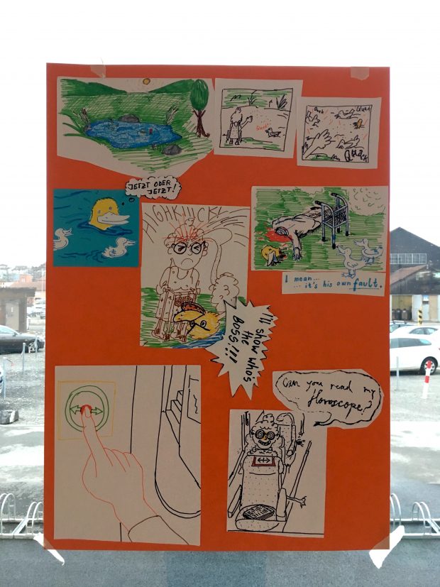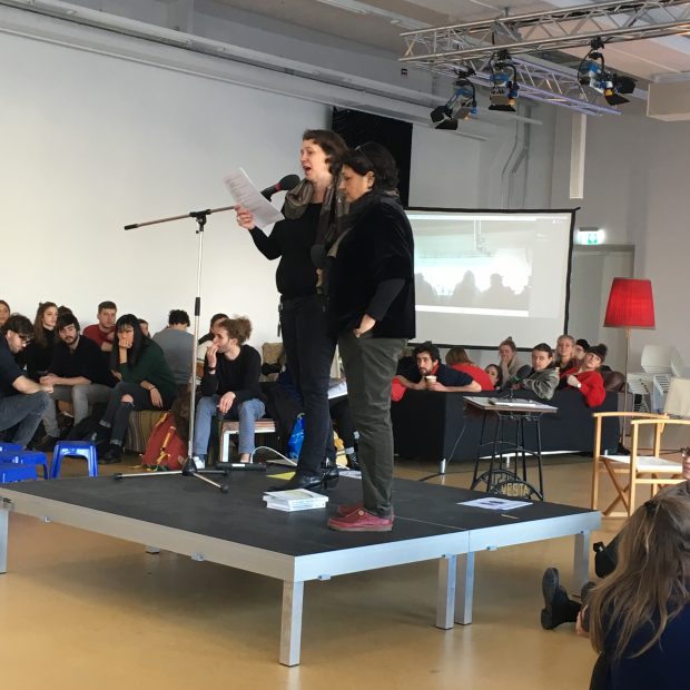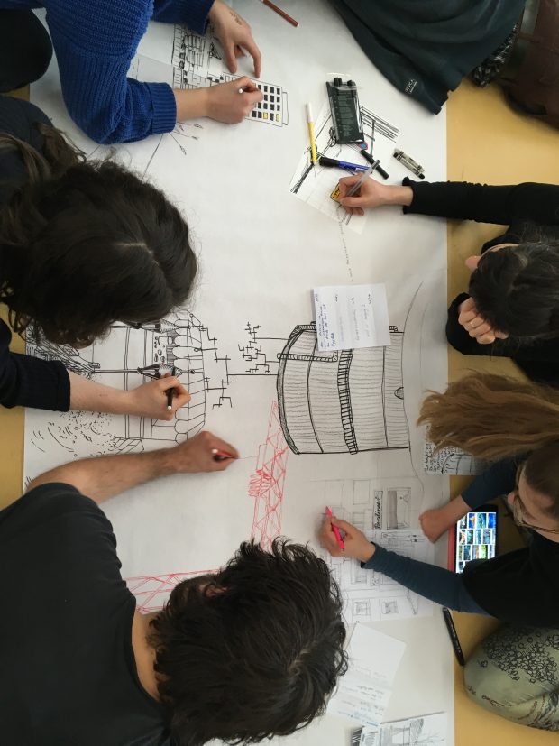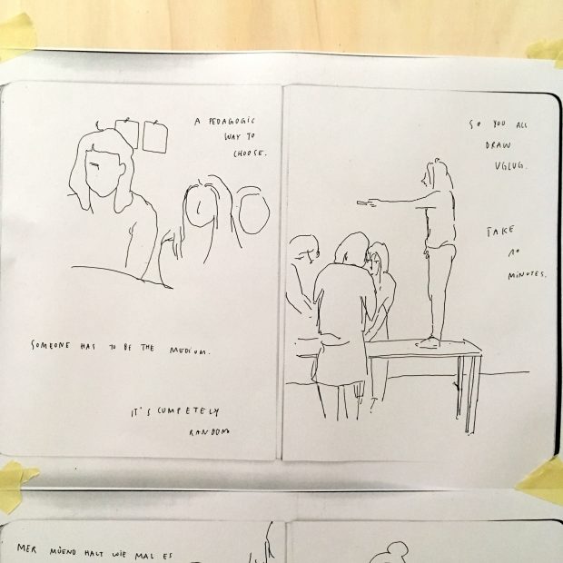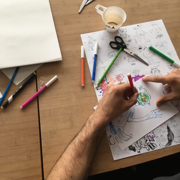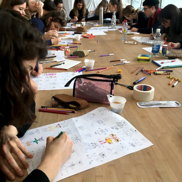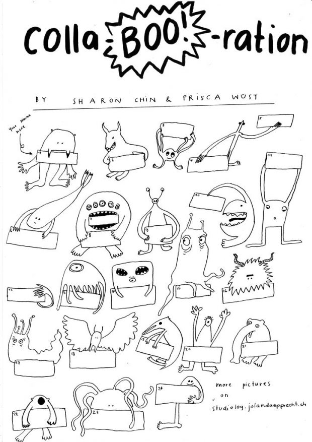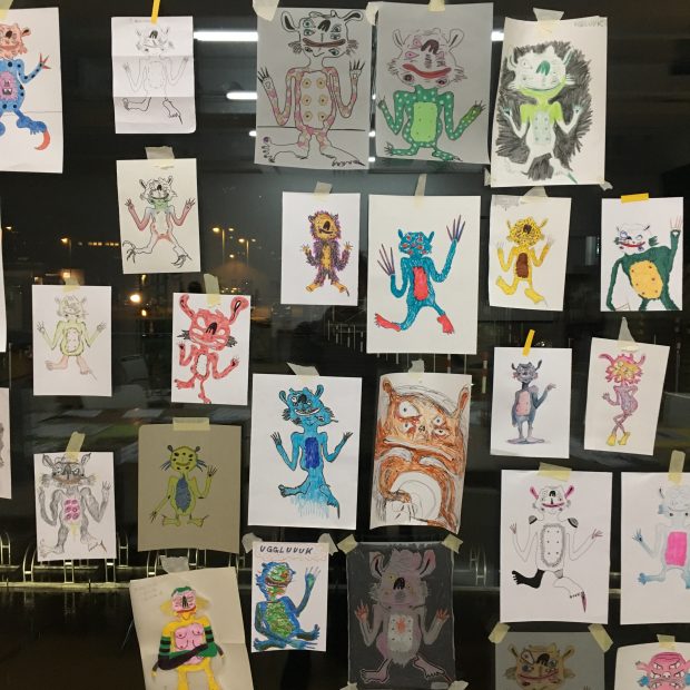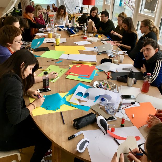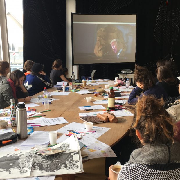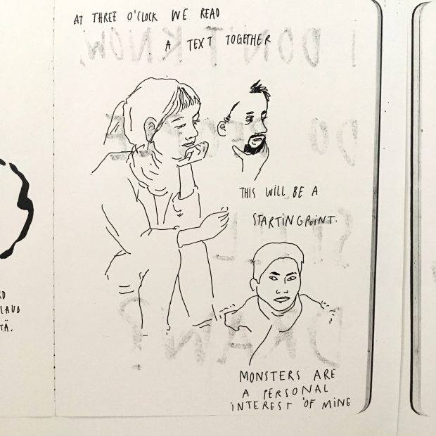 Phase two happened in January 2018, with a week-long physical gathering hosted by Lucerne University of Applied Arts and Sciences. STUDIOLOG artists took part in talks and workshops with students from the university. Prisca and I named our workshop Colla-BOO-ration!. We used the subject of monsters to explore being present with fear and uncertainty. Students created monsters, narratives, landscape settings and a performance. STUDIOLOG and its ongoing conversations are documented on https://studiolog.ch/